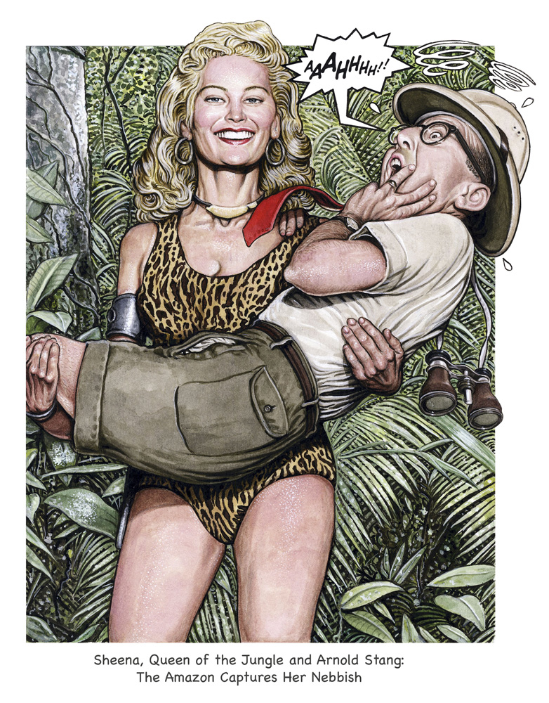 "I saw this as a black and white photo in the R. Crumb Handbook and loved it," recalls Friedman. "Stang was a Berle cast regular, and McCalla, dressed as Sheena, was a guest that week. The photo was captured backstage, sans props or setting. I saw its potential as an adapted illustration, deserving full color, depicting Stang, adorned with pith helmet and binoculars, as a geeky bird watcher who just happened to wander into Sheena's lair."