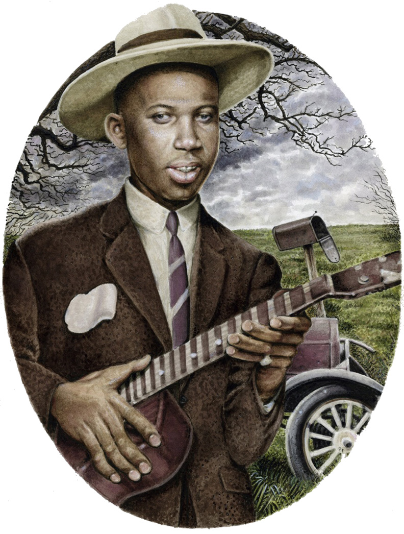 Drew Friedman's portrait of Johnson, based on the new photograph, places the blues master near a jalopy and a forlorn mailbox in a bleak, rural setting, with a backdrop of bare branches and ominous clouds. May 8 would have been Robert Johnson's 104th birthday, but he only celebrated 27 before his life ended under mysterious circumstances.