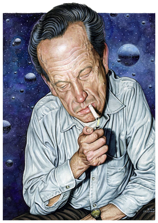 Drew Friedman rendered this portrait of legendary MAD and EC Comics cartoonist Wally Wood (1927-1981), one of the greats of comic illustration. Wood, along with Will Elder, exploded on the pages of MAD when it debuted in 1952 as a comic book under Harvey Kurtzman. (See Drew's portraits of Elder, Kurtzman, and Al Jaffee, also available as limited edition fine art prints.) Wood next contributed to Kurtzman's short-lived Trump magazine, after which he returned to MAD until the mid-1960s. EC publisher William Gaines once observed, "Wally may have been our most troubled artist. I'm not suggesting any connection, but he may have been our most brilliant."Wood provided illustrations for books, advertising, packaging and products; gag cartoons, record album covers, and posters. He created pencil sketches for Topps' landmark Mars Attacks trading cards and Ugly Stickers series. He was also renowned for science fiction/fantasy illustrations (hence the portrait backdrop). A nasty drinking habit curtailed Wood's professional ascendance, and he ended his career drawing porn for a pittance.